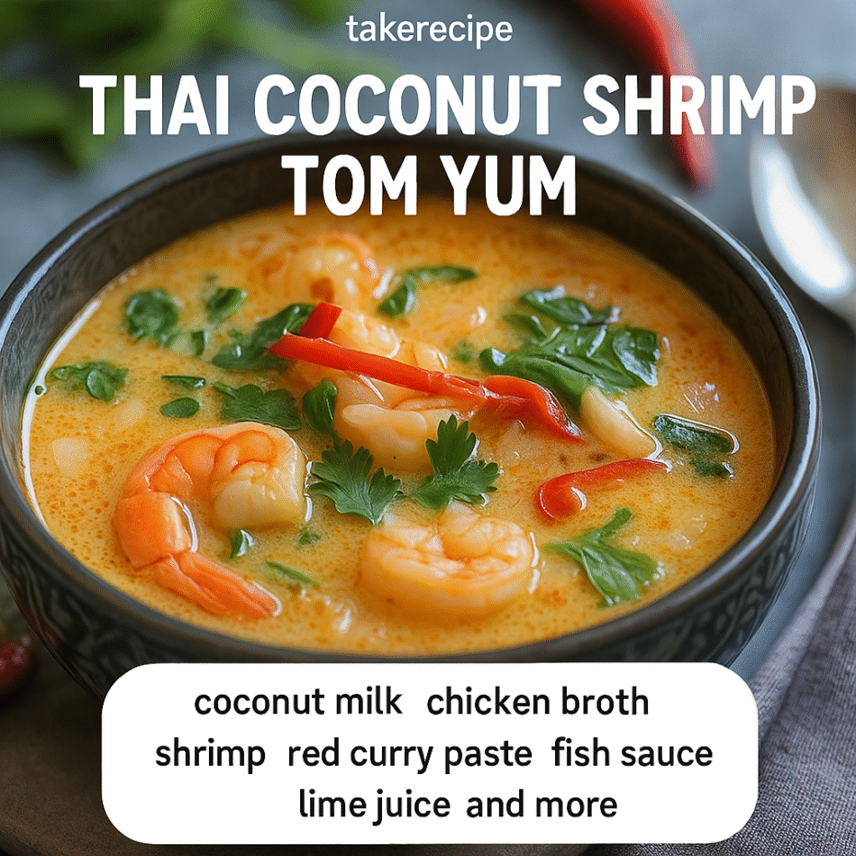Thai Coconut Shrimp Tom Yum Ingredients: 1 tablespoon vegetable oil 2 tablespoons red curry paste 3 cups chicken broth 1 can (400 ml) coconut milk 1 tablespoon fish sauce 1 tablespoon soy sauce (optional) 1 tablespoon brown sugar Juice of 1–2 limes 2 stalks lemongrass, smashed and cut into pieces 3–4 kaffir lime leaves (optional but authentic) 1-inch piece of fresh galangal or ginger, sliced 2–3 red chili peppers, sliced (adjust to spice preference) 200–250 grams (about 1/2 lb) raw shrimp, peeled and deveined 1 cup mushrooms, sliced (shiitake or button work well) Fresh cilantro and Thai basil for garnish Lime wedges for serving Prev Page1 of 2Next PageInstructions in Next Page Article Categories: Soup Recipes